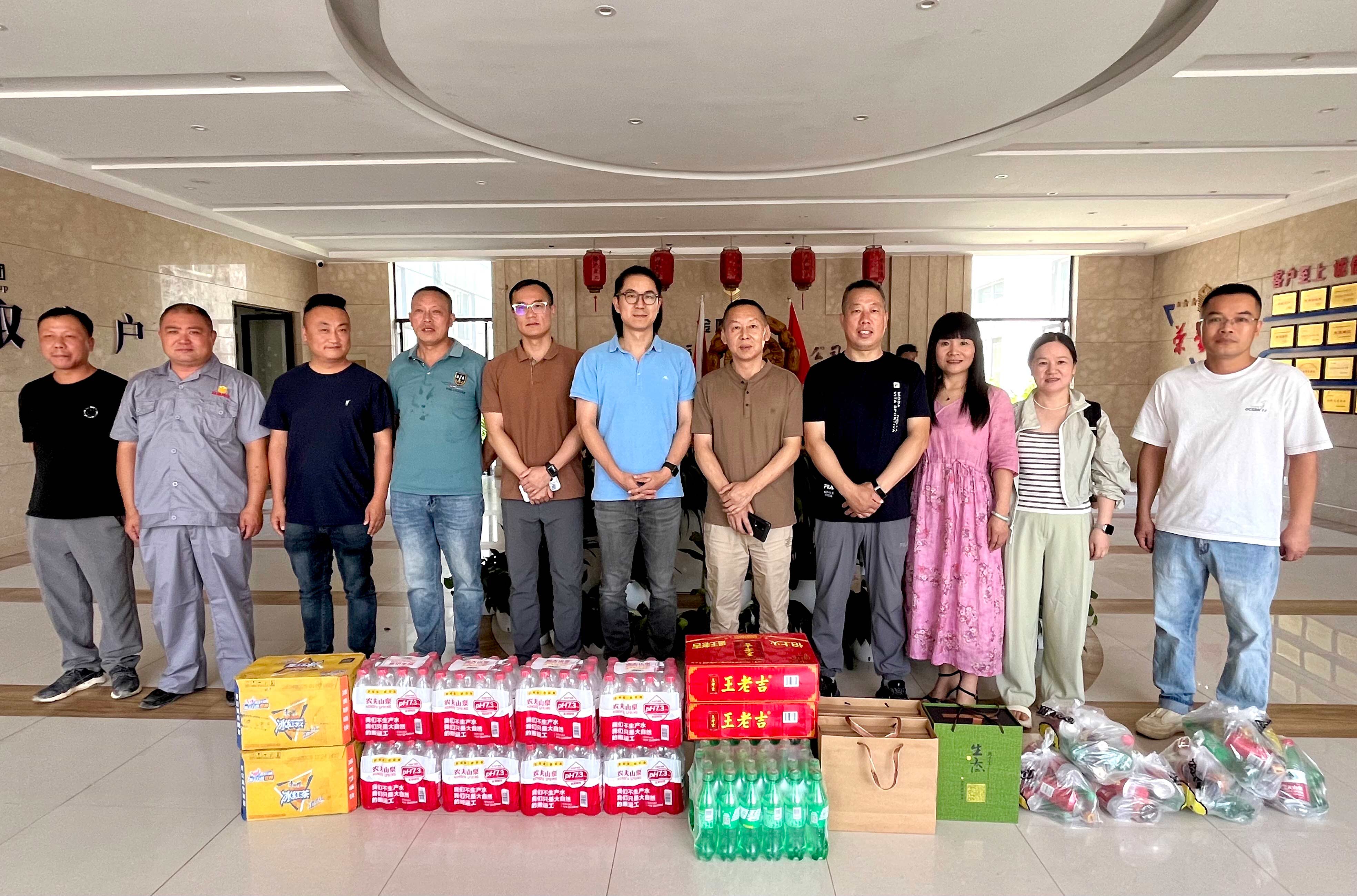 集團高管層分三路慰問近20家子公司。走訪中,集團領導深入子公司生產場地,了解各家公司的生產任務安排和員工的作息排班情況?!按蠹倚量嗔?,高溫天氣一定要做好防暑降溫工作!”在高溫工作現場,傅融總裁代表集團向奮戰(zhàn)在一線的員工致以親切的問候,并為他們送上冰紅茶、王老吉、礦泉水等清涼物資,對他們在高溫下堅守崗位表示感謝。傅總叮囑大家工作中要增強安全防護意識,落實好防暑降溫措施,確保安全生產,平安度夏。